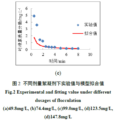 圖2表示在不同PAC劑量下實(shí)驗(yàn)值和擬合值比較。從圖中可看出,采用二級動力學(xué)模型描述PAC絮凝小球藻是合適的,特別是在絮凝劑劑量小于100mg/L時,實(shí)驗(yàn)實(shí)測數(shù)據(jù)與擬合曲線吻合。在PAC劑量為123.5mg/L和147.8mg/L時,絮凝時間小于2min時,實(shí)驗(yàn)實(shí)測數(shù)據(jù)和擬合值有一定的偏差,這可能是在絮凝初期,礬花顆粒較小,沉降速度較慢,同時取樣位置液面下2cm處,造成實(shí)驗(yàn)值偏高,當(dāng)沉降時間大于2min時,礬花顆粒增大,沉降速度增大,實(shí)驗(yàn)值與擬合值較為吻合。