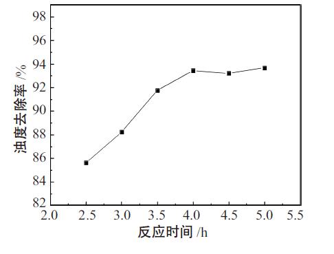 由圖5可以看出,隨著反應(yīng)時間的延長,濁度去除率逐漸增大,產(chǎn)品的絮凝效果顯著提高,反應(yīng)時間為4h時,濁度去除率達到較大,再繼續(xù)延長反應(yīng)時間,濁度去除率變化不大。這主要是因為,反應(yīng)時間過短,反應(yīng)體系不能吸收足夠的熱量進行水解反應(yīng),進而影響聚合反應(yīng),導(dǎo)致產(chǎn)品的聚合度不高。隨著反應(yīng)時間增加,越有利于聚合反應(yīng)的順利進行,產(chǎn)品的鹽基度增大,濁度去除率上升。反應(yīng)時間過長,對產(chǎn)品鹽基度增加的貢獻不大,同時浪費大量資源,影響生產(chǎn)周期。較后確定較佳反應(yīng)時間為4h。